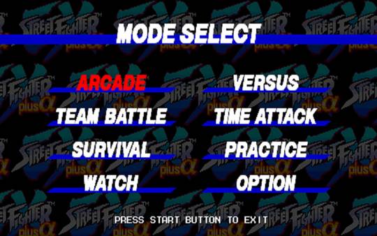 3) Time Attack mode – o título é auto-explanatório. Basicamente, seu lutador deve escolher uma de seis diferentes rotas ou “cursos”, A, B, C, D, E ou F. Mostra-se no menu com quem você terá de medir forças em tempo-recorde caso escolha cada uma das letras. Só massacrando todo mundo e fazendo tudo isso num bom tempo é que seu nome pode ser incluído no ranking. As rotas A e B incluem adversários simples no número de 8. A “C” apresenta os 4 secretos e você adivinhou se acha que este é o caminho para liberá-los: Evil Ryu, B. Hokuto, Cycloid Beta e Cycloid Gamma. As demais rotas são invariavelmente contra Bison, Garuda e Akuma, mas são osso duríssimo de roer.