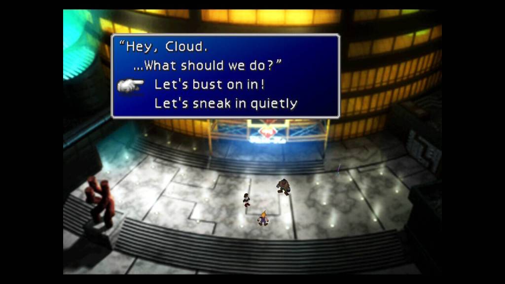 Voltemos ao fim do parágrafo que diz: Essa seqüência é tão famosa que o remake se sentiu obrigado a iniciar reproduzindo-a. Continuemos a partir daqui para analisarmos o enredo. “Vamos lá, novato, me siga.”, é a primeira linha de diálogo do jogo, direcionada ao jogador pelo (por enquanto) NPC (e já, já PC) Barret. Em instantes a primeira batalha sucede, contra guardas fracos. Há duas opções de início, ataque e magia, mas usar magia nesse momento nem sequer é recomendado.