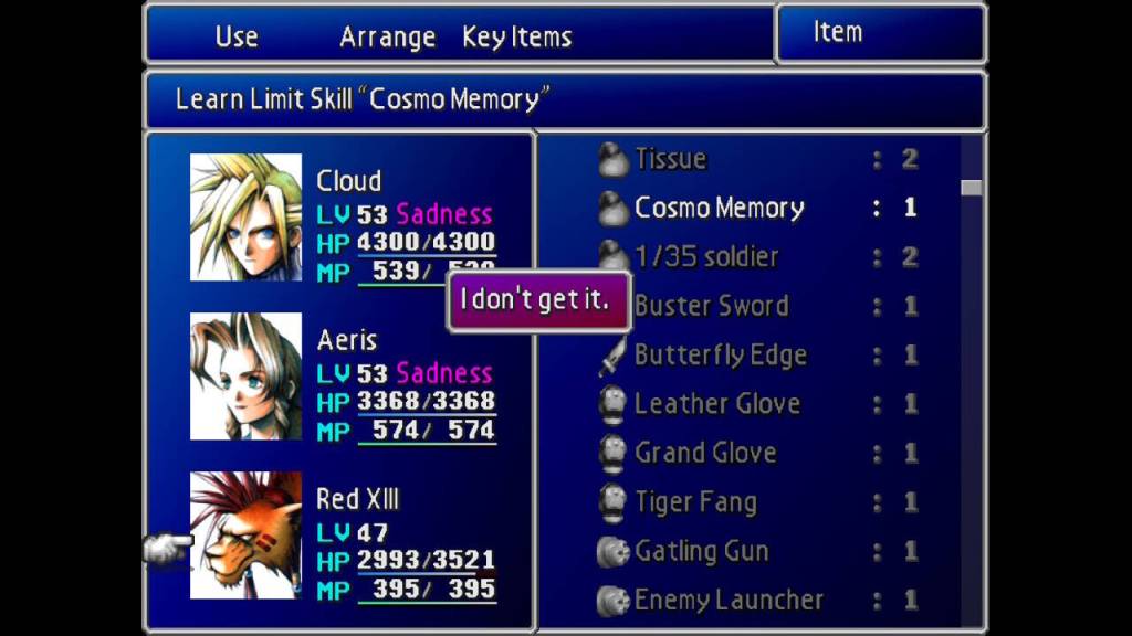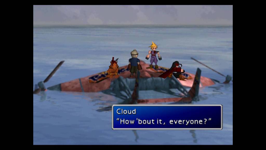 Cloud Strife. O protagonista por último. O garoto da alabarda. O edgelord, loiro no fim da adolescência, tipo bonitão, o sonho de qualquer um. Assim Cloud sparecia nos materiais publicitários, e assim parece no começo do jogo. Sua postura e atitude deve ter vendido muitas cópias do jogo. E no entanto Final Fantasy VII sabia que era preciso ter substância e subverte todos esses tropos carcomidos e esfarrapados. O taciturno Cloud pode ser mais heróico e “irrealista” que Tifa, mas ainda é feito de carne. Desde a primeira missão, ao demonstrar sintomas psicóticos no reator, o RPGista esperto entende que Cloud pode não ser a testemunha ocular mais fiável, e a pessoa com menos segredos no grupo dos personagens controláveis. Outro grande choque se dá quando o time chega a Nibelheim e tudo parece intacto… Toda a reputação e imagem de Cloud começam a ruir em farelos ao longo do enredo, o que é muito bem-executado pelos roteiristas da Square. A verdade é que sem aqueles que lhe dêem suporte Cloud não pode vencer Sephiroth. Ele pensa até em desistir da jornada após o incidente do templo. Barret, Tifa e Aerith seguram sua barra.
