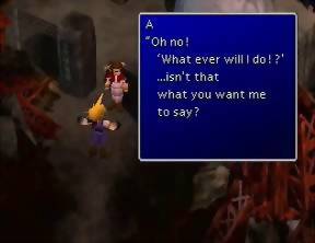 Inicialmente Barret é o contraponto do protagonista número 1, isto é, Cloud, e na primeira missão ambos não conseguem se entender mesmo que estejam trabalhando juntos. Barret exibe preocupações ecológicas. Cloud não tem tempo para perder com hippies com basicamente o dobro do seu peso. É batalhando juntos contra o primeiro boss que Cloud e Barret começam a se aproximar, ainda que de modo infinitesimal. Talvez os videogames sejam privilegiados em relação a qualquer outra arte, porque permitem que o receptor participe desse processo. Só num game seria possível estabelecer uma relação que cresce paulatinamente entre um mercenário e sua parceira muda, por exemplo. Um filme poderia fazê-lo, mas não tão bem. Esse é um exemplo mais recente que o jogo que analisamos agora, Metal Gear V (Snake e Quiet). Desde 1997 os games caminharam muito, se aproximando mais e mais do cinema; entretanto, há a barreira da gameplay, que impede a fusão dessas duas mídias; cremos que isso depõe a favor dos jogos eletrônicos e contra os filmes na hora da projeção e identificação com papéis. Parte da empatia que criamos por personagens interativos vem, é claro, do montante de tempo que dedicamos a eles. Trinta, cinqüenta horas é muito diferente de duas. Uma série teria de ser muito longa se pensa em rivalizar com o carisma dos protagonistas de Final Fantasy VII.