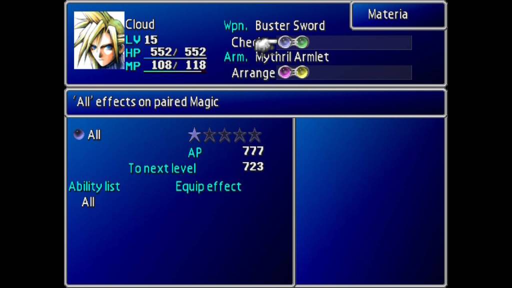 Nos combates, uma das grandes inovações foi o implemento das materias. As materias são a base do sistema de magia e de poderes elementais, permitindo grande flexibilidade entre os personagens, evitando, ainda, a formação de classes de origem entre os personagens, que estariam fadados a lutar desta ou de outra forma, se bem que personagens como Aerith sempre são mais fortes defendendo do que atacando (por conta dos limit breaks). Mesmo convocações são realizadas via uso de materias. O segredo está em limitar o número de materias equipáveis a cada momento da gameplay. Materias podem aumentar de nível exatamente como os próprios personagens. A determinado nível novas habilidades são destravadas. O que talvez limite o potencial das materias é a dificuldade do jogo, considerada baixa. Mesmo jogando ao acaso, sem usar combinações ótimas de materias (combos) para o melhor efeito, é possível zerar o jogo tranqüilamente.
