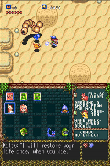 | (X) um tipo específico de jogador Quem? Iniciantes em Action RPGs; Zelda-maníacos procurando dungeons e puzzles simples. | Quem jogar este também poderá gostar de: Alundra (PS) Beyond Oasis (GEN) Diablo (PC) Landstalker (GEN) The Legend of Zelda: A Link to The Past (SNES) Phantasy Star IV (GEN) Pokémon Crystal (GBC) Pokémon Gold & Silver (GBC) Shining Force CD (SCD) Shining in The Darkness (GEN) Soul Blazer III: Terranigma (SNES) Super Mario Kart (SNES) Super Mario World (SNES) Sword of Mana (GBA) Sword of Vermilion (GEN) |