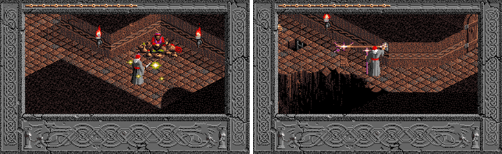 A perspectiva é um meio-termo entre “de cima” e “de lado”, o famoso ¾ (vista aérea inclinada). Old school gamers já sabem o que significa: isometric action games são mais traiçoeiros por si sós, ocasionando mais mortes gratuitas devido a ilusões de ótica ou controles imperfeitos. No caso de The Immortal, o boneco responde bem aos seus comandos, talvez bem até demais: Gandalf é um pouquinho mais sensitivo a toques no direcional do que desejaríamos e, bem, estamos falando de uma interface que apela na gratuidade das armadilhas – então fique DUPLAMENTE alerta, se é que em 30 minutos de jogo você já não internalizou a MENSAGEM… Devido à visão do controlador, listei Landstalker e Light Crusader, da biblioteca do Mega Drive, entre os jogos parecidos com este. Você vai reparar que não é uma comparação estritamente “panorâmica”: os três jogos são considerados bons Action RPG/Adventures da máquina da Sega, então os outros games serão uma boa pedida se você acabar gostando de TI…
