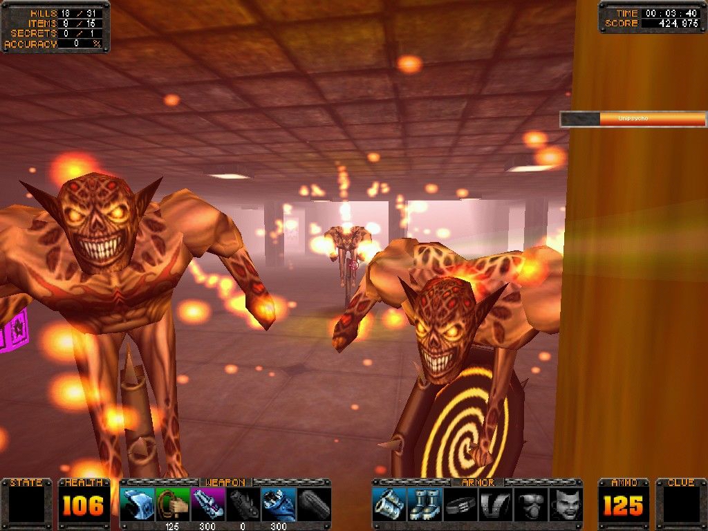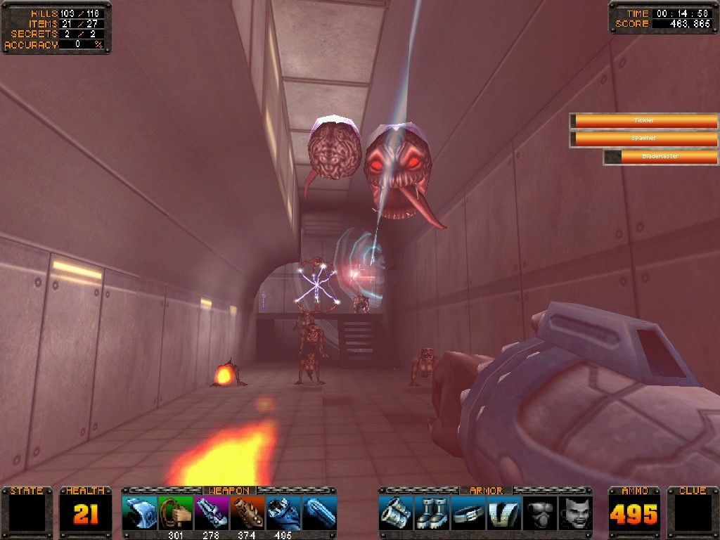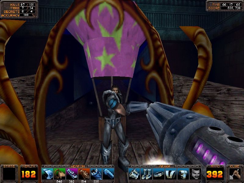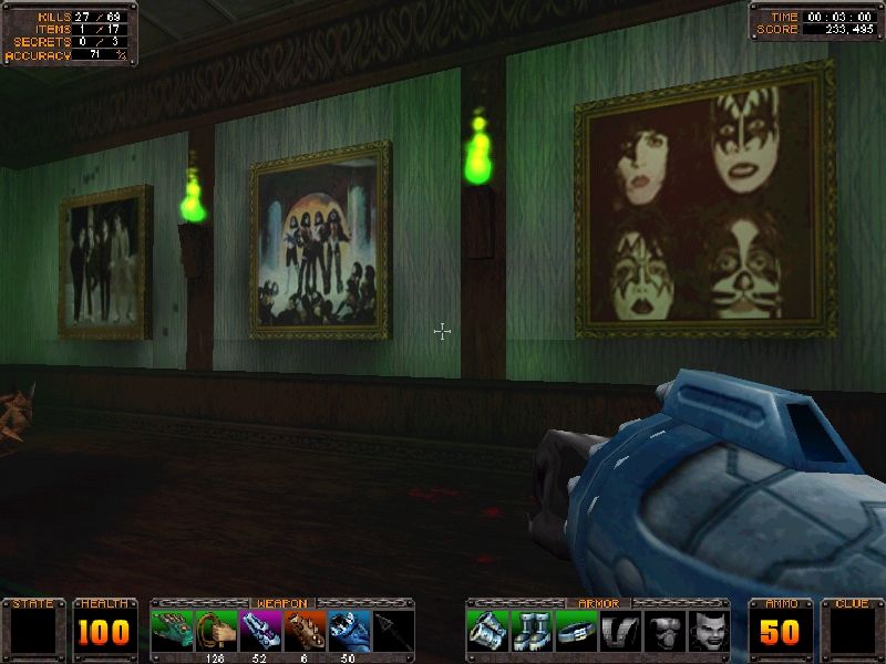Então… por que não há quase nada de KISS no jogo? Porque não combina… E porque na época (ano 2000) ainda eram raros os gamers que ligavam o som e deixavam o computador ou o videogame no mudo, tratando de agir sob a própria playlist como estímulo fatal. As músicas do K.I.S.S. são meio “Uh, eu tenho atitude, eu tô feliz, vamos festejar – mas eu sou roqueiro, lembre-se disso!”; baladas não são infreqüentes na discografia dos caras. Então, os desenvolvedores não tiveram escrúpulos em deixar essa sonoridade de lado e partir para eletro-beats que realmente empolgassem o atirador! Não é uma defesa da qualidade da trilha sonora, mas serve de consolo e justificativa. Spoiler irrelevante: não, não tem nenhuma faixa da banda como easter-egg na zeração.