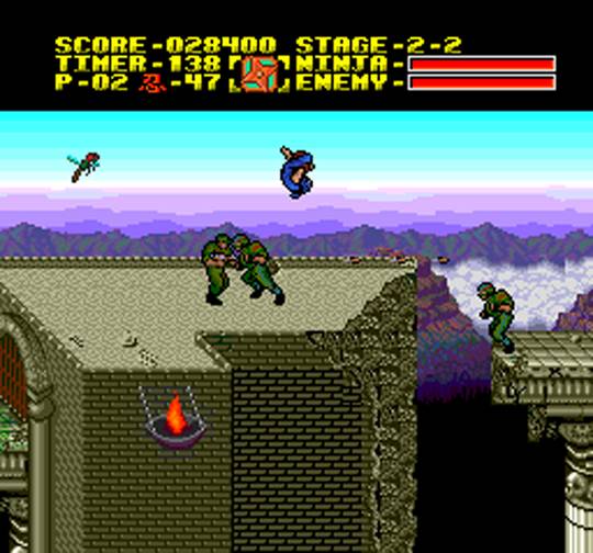 A ação corre um pouco mais veloz e o posicionamento de certos adversários foi trocado. Isso não torna o jogo ainda mais difícil (o que seria calamitoso!), pelo contrário: o ato 6-2, ilustrando, que era terrível de atravessar no NES, ficou significativamente menos problemático no PCE. Morcegos e águias, sempre prontos para agredi-lo assim que Ryu pisa na beirada de plataformas para onde acaba de pular, muitas vezes foram realocados mais atrás, deixando de interferir tanto no seu progresso. Alguns trechos que eram simplórios podem estar com dificuldade acrescida, no entanto. No balanço geral, Ninja Gaiden teve sua dificuldade amansada.