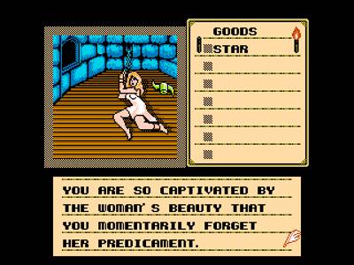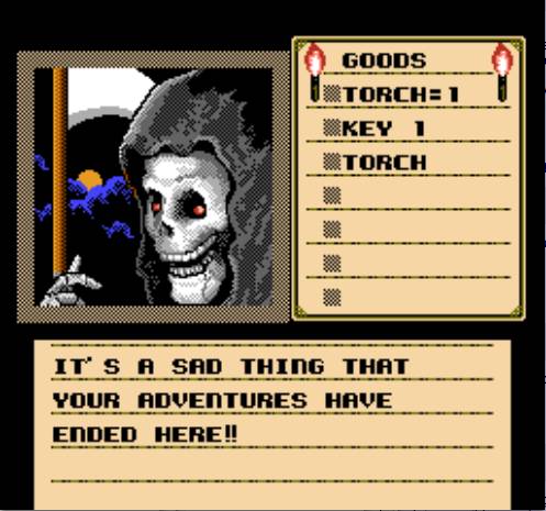 O que mais me desgasta, entretanto, deixei para um novo parágrafo, e é o fato de que o jogo é cronometrado. Não no sentido comum, de que haja um relógio prestes a zerar, como em Prince of Persia, por exemplo. O castelo é escuro e não seria Warlock o responsável por providenciar sua iluminação, certo? O protagonista precisa de tochas para enxergar, e o fogo vai consumindo a madeira até não sobrar mais nada. Sem luz, você automaticamente MORRE. Ficar preso por excesso de tempo num enigma significa desperdiçar tochas valiosas e ter de recomeçar do último save por falta de tochas. Ou, se os save points forem mal-escolhidos, compromete-se toda a aventura e o melhor seria recomeçar do zero (você padece em soft-locks). Então, o que eu disse sobre turnos e decisões ilimitadamente pensadas não era tão genuíno assim, he-he… O fato é que não precisavam dessa imposição, já que mesmo sem as tochas Shadowgate já é árduo o bastante.