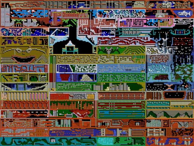 Para se ter uma idéia da pedra no sapato que é explorar um gigantesco labirinto (mesmo para além dos 8-bit) sendo tão pequeno (seu personagem ocupa uma área ridícula da tela), devo inserir números: se pusermos lado a lado todas as telas do jogo e as dividirmos eqüitativamente, teremos 4 unidades de largura por 16 de altura (trata-se de um enorme retângulo). Cada uma dessas unidades é composta de 12 “casas” de altura por 64 de largura. O personagem controlável, qualquer que seja, mede “1 casa” de largura e de altura! Para os alérgicos a calculadoras: (4×16)x(12×64)= 64×768 = 49.152 casas ou caixas ou quadrados ao todo! Só tenho uma palavra para essa quantia: IMENSA. Os ainda reticentes e incrédulos podem conferir, abaixo, uma fotomontagem com toda a área de jogo a ser percorrida (inúmeras vezes, já que você nem sempre sabe o que fazer na sala de imediato, nem tem os itens para isso, sem falar que precisa se revezar no controle dos membros da família DraSle, não vá esquecer!):