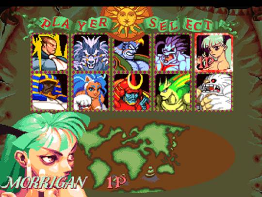 Mesmo que porrada seja coisa séria (e disso a Capcom sabe muito bem), ela achou por bem que deveria “desdramatizar” um pouco as carrancas dos personagens. Nada de M. Bison/Vega buscando a dominância mundial via organização criminosa Shadaloo, nem Ken Masters buscando vingança ou Ryu se comportando como um Bruce Lee compenetrado ao enfrentar o impiedoso Sagat… Os personagens de Darkstalkers são todos provindos de contos de terror ou coisa que o valha e são muito mais bem-humorados. O objetivo ainda é o mesmo de The World Warriors (o primeiro subtítulo de Street Fighter II): ver na prática quem é o mais forte. São 10 lutadores no menu, acrescidos de 2 chefões, acessíveis tão-só via GameShark. Temos Demitri the Vampire (que parece estar no uniforme do Gladiador do Império Shiar, dos X-Men, repare bem!), Jon Talbain o Lobisomem, Victor the Frankenstein, Lord Raptor o Zumbi, Felicia a Mulher-Gato (?!), Morrigan the Succubus (muitos aprenderam o que é uma súcubo justamente por causa deste jogo!), Anakaris, amiguinha do Brandon Fraser (ok, A Múmia!), Bishamon, o Samurai Amaldiçoado (não sei de que diabos de enredo ou lenda vem essa criatura, mas é como se fosse uma armadura com espada que não tem vida própria e só responde à sua sede de sangue), Rikuo o Tritão (criatura marinha) e Sasquatch, o Abominável Homem-das-Neves. Os chefes são Huitzil (um andróide) e Pyron (demônio). Deu para perceber que todas as searas dos Horror-B movies foram inteligentemente visitadas, que os bonecos que protagonizam o jogo são imaginativos, dinâmicos e carismáticos, alguns deles impondo respeito, outros chamando a atenção devido à esquisitice ou fofura excessivas. Meu fighter favorito – e o de muito mais gente – é a Felicia, que “mete as unhadas” no oponente até sair sangue e mia o tempo todo. Ainda assim, o personagem que mais ganhou notoriedade no universo Darkstalkers, que chegou a invadir jogos de outras marcas da Capcom, foi Morrigan, outra rainha da sensualidade – grande façanha, especialmente porque muitos que gostam do artwork de Morrigan em participações em outros jogos como Capcom vs. SNK mal sabem de que jogo ela surgiu! Falando no desenho primoroso, muita gente prefere os traços dos personagens de DS1 em relação às modificações de grande monta efetuadas a partir de DS3. O principal charme deste Darks seminal reside na distribuição de cores original que abusa de degradés.