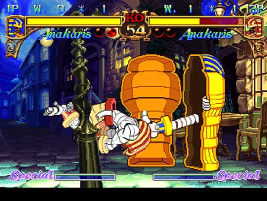 X, Bola, Quadrado e Triângulo acionam soco e chute fracos e médios. L1 e R1 se encarregam do soco e chute fortes. (Ou do equivalente a “soco” e “chute” para cada um nessa horda de entidades sobrenaturais – um dos atrativos do jogo é a hilaridade dos gestos dos golpes que acabam saindo. Por exemplo: em vez de socar Sasquatch vai dar petelecos com seus dedos enormes. Anakaris, totalmente flexível, vai esticar seus braços até eles adquirirem o aspecto de duas serpentes de boca aberta. Lord Raptor vai esfregar uma serra elétrica na sua cara!) A barra de special vai enchendo conforme se ataca e se defende (os dois, sem distinguir). Cem por cento preenchida, ocorre um período muito breve para soltar ataques mais destrutivos. Quando – e se – esses golpes entram, os efeitos são espetaculares (assumindo que o comando, mesmo que milimetricamente executado, foi lido pela engine, e que a CPU não bloqueou miraculosamente). O samurai corta os outros em 2, o faraó elabora um encantamento que transforma o adversário em animal, a mulher-gato imita a dash do Sonic, só que com a adição de garras afiadas na sua cara, etc… Mas nada disso são fatalities, e a luta segue após! Muita gente agradece o ramo dos jogos de Luta ter se simplificado tanto ao longo do tempo (no quesito jogabilidade, pelo menos), porque fazer meias-luas sincronizarem com vários botões pode ser um autêntico tormento. A fração de décimos de segundos que o sistema do jogo pede para “liberar” o funcionamento do seu golpe é desumana! Contando que às vezes os specials são emitidos com soco/chute forte isso só piora a situação (os botões L e R são mais desconfortáveis, frouxos). Tudo isso sem considerar que enquanto você luta contra os próprios controles a inteligência artificial não dá o menor recesso e te espanca estupidamente!