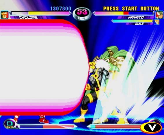 Entretanto, em que pesem as aparências, MvC é algo mais desequilibrado que Street 2. Em MvC2 quem sabe jogar como atirador leva uma boa vantagem, enquanto que em SF2 dois veteranos que tirassem o máximo do Ryu e da Chun-Li, respectivamente, quase com certeza empatariam. Seguem as razões para que isso suceda no atual Marvel vs. Capcom: 1) projéteis aéreos – se o jogador lançar uma magia depois de um mortal para trás, logo antes de cair no chão, à meia-altura, seu ataque será dificílimo de esquivar, seja por baixo ou por cima (uma dash do adversário não é suficiente para tirar a cabeça do caminho da magia; um pulo precisa ser o mais alto possível, ou os pés serão atingidos); 2) rolamentos – essa manobra é exagerada em MvC2. Tem grande alcance e é velocíssima. Portanto, quem gosta de atacar de longe poderá sempre contar com um jeito simples de dar evasivas em momentos críticos; 3) o push-blocking – como dito, o push block afasta o adversário consideravelmente, dando tempo ao tempo; 4) tech-hitting & air recover – em MvC2 escapar de arremessos é mamão-com-açúcar. É como passar da faixa branca para a cinza ou amarela – dependendo da arte-marcial –, para usar uma metáfora mais apropriada! Portanto, lutadores de mano-a-mano terão que buscar outras alternativas, já que apelar para throwings – que normalmente deixariam o adversário tonto e indefeso – não é viável aqui; 5) ataques dos assistentes – ao contrário das limitações para chamar o terceiro lutador em MvC1, aqui esse recurso é quase infinito, aumentando a possibilidade de “cheating” sobretudo nas partidas entre amigos. No momento em que o lutador estiver bloqueando seus projéteis, é bem conveniente (e sacana) acionar um assistente especialmente orientado a imobilizá-lo, para que ele receba as bolas de magia em cheio! Mais do que isso: com super jump + assistência, a câmera segue quem executou o comando em seu deslocamento pelo ar, escondendo o convocado especial e a vítima agarrada! Passa longe do fair play, e quer saber? Por isso é que vemos essa estratégia ser usada igual camelo no deserto e cloro em parque aquático… 6) 99 segundos no cronômetro – se o tempo não for setado como “infinito” nas opções, essa é a duração-padrão do round. Aí então, basta agredir um pouco seu oponente e passar o resto do tempo fugindo, empregando variações dos 5 recursos anteriores. O lutador de corpo-a-corpo ficará de mãos atadas! Resumindo: para um multiplayer justo entre veteranos, combinem de usar, ambos, personagens do mesmo estilo.