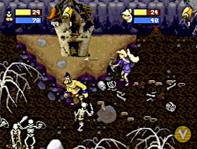 Os combates ocupam um bom naco da jogatina. São, como era de se esperar, embates em tempo real. Escolher como lutar começa no menu de seleção do seu guerreiro, mas se estende a algumas posturas e botões na interface ao vivo. Todo personagem tem um ataque normal – para Herc e Jason são porradas com os braços, para Atlanta é uma flechada – e um outro especial. Iniciantes devem preferir controlar Atlanta, mais ágil e capaz de danificar inimigos à distância; veteranos quem sabe queiram zerar a aventura uma segunda ou terceira vez usando os demais… São cerca de 2 dezenas de armas secundárias, ainda, para acumular durante a jornada. Lanças, bombas, bolas de neve, “bafo de fogo”, trovões e até armas de raio (bem exótico para a Grécia Antiga, eu sei!) são algumas delas, e as diferenças nos pontos fracos dos inimigos garantem que você revezará bastante entre seu arsenal. Todas essas armas, mesmo aquelas que aparentemente não dispõem de “munição” para funcionar, se desgastam com o tempo, mas há sempre réplicas delas para apanhar de novo e de novo. Só tem uma fraqueza diante de todo esse repertório: inexiste um menu de seleção instantânea do objeto desejado, então, mais ou menos como na lenta interface de Zombies Ate My Neighbors (SNES), o jogador terá que apanhar um pouquinho do controle, recorrendo toda hora aos botões-de-gatilho na parte de cima, enquanto os inimigos, alheios a seu desconcerto, agridem sem trégua.