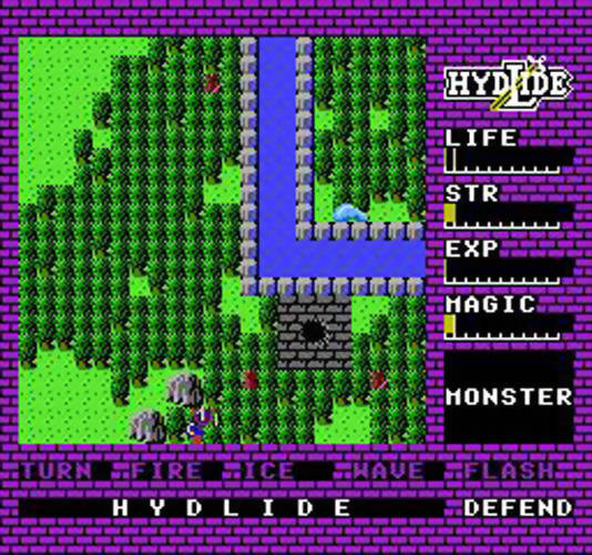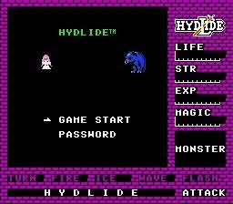 Hydlide não é exclusivo do NES nem foi lançado primeiro no 8-bit da Nintendo, mas é de longe nessa plataforma em que ficou “famoso”. Nele, você joga como o cavaleiro Jim. O dragão diabólico Boraelis ou Borealis, ou qualquer que seja o nome, que aparece trocado no manual (Voralis), na caixa do jogo e depois no próprio jogo…, converteu a princesa do reino em três fadas (?!), e cabe a você restaurá-la à forma original e matar o dragão, não necessariamente nessa ordem.