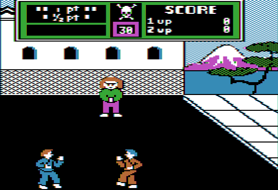 Deixe-me dizer que mesmo para 1986 o visual não é nada impressionante. Um programador chinfrim deve poder replicar o software em qualquer sistema a partir de um Atari 8-bit. Bitmap sprites quadradões nem tão feios mas cuja animação é pavorosa são o banquete nostálgico aqui posto (os kimonos parecem armaduras de metal, de tão imóveis). Os backgrounds são facilmente superados pelos fundos de Super Mario Bros.