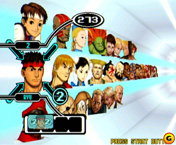 A liberdade para montar o seu time continua intacta, tirando que não podem mais ser listados 4 membros 1:4. As velhas combinações [ dois 1:4 + um 2:4 ], [ um 1:4 + um 3:4 ], [ dois 2:4 ] e [ um 4:4 ] mantêm-se de pé. Claro que nem todos de uma mesma categoria são rigorosamente empatados, sem handicap interno algum. Uns vão ser sempre (ligeiramente) melhores graças a técnicas de defesa e danos de bonificação exclusivos. Mas sem essa clivagem não teria graça nenhuma. Em The King of Fighters ‘99, era possível mudar a ordem dos lutadores da equipe antes da luta sem o oponente tomar conhecimento, o que evitava o “stalking de tela”, que era optar por um time depois do amigo, pensando exclusivamente em como contra-atacá-lo com máxima eficácia. A Capcom importou esse interessante conceito para tornar as lutas mais imprevisíveis e proveitosas. Quem não gosta do ratio system ainda tem como dele “fugir” optando por lutas 1 x 1 ou 3 x 3. Para nenhum entusiasta de Street nem de KOF botar defeito!