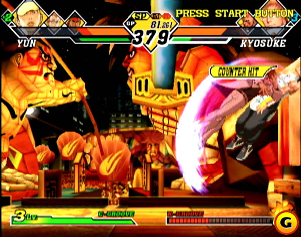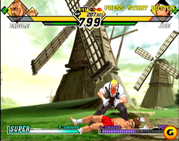 A profundidade do sistema o torna mais aditivo do que crack: inspirando-se nos “Isms” (diferentes estilos) de Street Fighter Zero 3, você escolhe o Groove de luta que julgar mais adequado. Dessa vez, arregaçando com a variedade de Capcom vs. SNK 1, o número de grooves não se limita a 2: são, em tese, 6, mas mais adiante veremos que essa conta pode ser multiplicada ao infinito! 3 representam muito bem esquemas capconianos de outras viagens, e 3 as diversas jogabilidades já intentadas pela SNK no Neo Geo e fliperamas. Nada mais justo e formidável. O C Groove é a encarnação mais próxima da jogabilidade de Zero/Alpha; A Groove puxa mais para o lado do “modo V” de SF Zero; P Groove privilegia o “parrying” (bem Street Fighter III); S Groove é idêntico ao Extra Mode de KOF; N Groove ao Advanced; e o K Groove enfoca no bloqueio, além de acrescentar um rage gauge (medidor de fúria), funcionando como híbrido de Samurai Shodown e Garou: Mark of The Wolves (Fatal Fury 8). Com todos os minimalismos imagináveis, a Capcom tornou cada groove um jogo totalmente à parte: bloqueio aéreo, corrida, recuperação tática, mini-pulos… Jogar 2 jogos ao mesmo tempo (você vs. seu amigo) não é para qualquer um (ou quaisquer dois)!