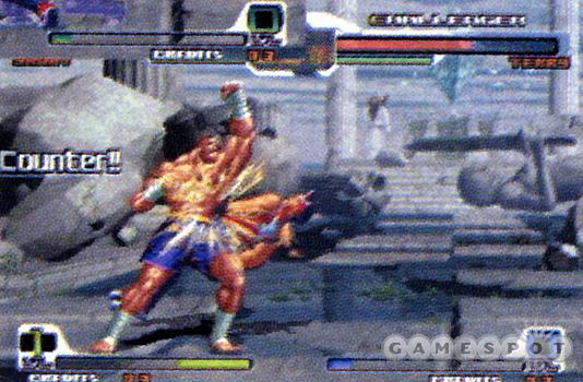 Mas ao invés de adotar um sistema em uníssono e consensual a empresa promoveu uma real fusão entre sua própria gameplay e a típica da SNK. Funciona da seguinte maneira: você escolhe entre SNK Groove ou Capcom Groove assim que liga o jogo. Cada empresa tem sua forma de lidar com a barra de especial, um ingrediente fundamental num jogo de luta que se diz competente e que tem hoje tanta importância quanto a inexorável barra de life na decisão do vencedor. A da Capcom é a seguinte: quanto mais hits se produz no adversário, mais sua barra se completa. A barra de especial é dividida em 3 níveis. Cada nível alcançado permite ataques especiais de determinado poder em escala crescente. A barra da SNK exige o carregamento manual da energia, sem relação com quantas vezes o inimigo é acertado – é como um guerreiro saiyajin aumentando o ki. Os botões exigidos são soco alto + chute alto (ou forte, como queira). Um brinde para a paciência extra que o gamer precisa ter ao jogar no SNK Groove é a ativação de Desperation Moves assim que a barra de life do próprio personagem atinge um patamar crítico (quase morrendo). A partir daí, vários golpes de impacto do lutador são liberados ilimitadamente, se você souber as combinações, é claro. Essa é a distinção mais relevante entre ambos os esquemas. Claro que os Grooves guardam também pontos em comum. Uma concessão que a Capcom fez – pensando inclusive no layout do controle de Dreamcast – foi reduzir seus botões de ação de 6 para 4, retirando soco e chute médios do inventário (igual fez em Marvel vs. Capcom 2, desagradando xiitas). Com dois botões de soco e dois de chute, L e R ficaram para a titia, digo, para provocações, e não influem no resultado final.