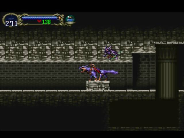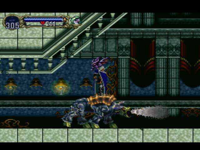 A próxima batalha (não necessariamente, já que a partir daqui a classificação como metroidvaniafaz-se valer) seria contra o Hipogrifo. Numa luta bastante demorada (ataques efetuando pouco dano) e life meter nanico, a CPU ensina como vencer de flawless victory esse segundo boss alado, suprimindo artificialmente a caixa de subweapon do topo da tela, significando que só usa uma das mãos – dessa vez Alucard não emprega o escudo, mas o personagem brinca com os limites da hit detection (nem sempre o que vemos é o que nos atinge, e uma animação de fogo, em seu limiar, pode ser uma zona de invencibilidade para o personagem) e mostra o melhor uso para a técnica de dash (Triângulo).