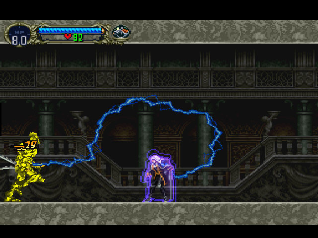 Voltando à gameplay após esse breve interlúdio nostálgico-prospectivo, ficou combinado que eu falaria das técnicas de spell ou feitiço, que dependendo das ações do jogador ganharão um menu exclusivo na tela de pause. Seja acionando acidentalmente uma das técnicas ou comprando-as do livreiro, estes são ataques mais complexos de Alucard, que exigem inputs característicos de jogos de luta, como meias-luas, combinações de botões, segurar uma tecla por cerca de um segundo, e tudo tem de ser executado com bastante precisão para que o “golpe” saia. Mais que um golpe, cada feitiço consome diferentes porções dos magic points e tem conseqüências variadas, podendo ser defensivas ou ofensivas. O mais interessante é que se a idéia não agrada o castlevaniamaníaco, ele pode ignorar esse segmento da gameplay em absoluto, sem prejuízo algum.