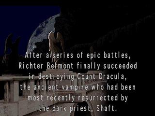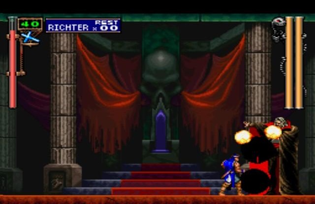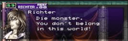 Richter: Estava a sua espera! Alucard: Me responda: por que um Belmont planeja a ressurreição do Conde Drácula? Richter: O Conde Drácula só aparece uma vez a cada século, então, 4 anos atrás meu papel estava cumprido. Se eu puder ressuscitá-lo, a batalha seguirá enquanto eu viver! Alucard: ………. Se é assim que você pensa, que seja. (Richter inaugura o grande duelo com seu ataque mais poderoso…)