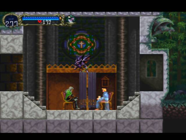 Maria: Então, você achou Richter? Alucard: Eu não sei se ele é aquele que você procura, mas eu achei um Belmont. Maria: É sério?! Então ele está mesmo aqui! Alucard: …Só que aquele que eu vi é o inimigo. Ele era o senhor deste castelo… Maria: Não, isso é mentira! Você se equivoca… E-eu… tenho que ir agora mesmo…