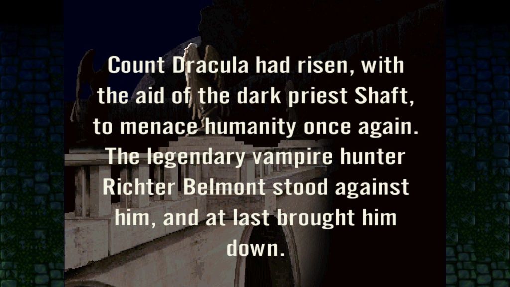 Um hino-homenagem aos serviços prestados pelo agora extinto clã Belmont durante séculos de chicotadas do Vampire Killer. Descanse em paz, amigo Richter! Dizem que usuários do X360 poderão ouvir essa canção em momentos diferentes do jogo…