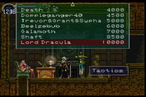 Para além de aquisições físicas, o livreiro vende até mesmo vídeos que ensinam a lidar com chefes. E não são vídeos comuns! Muitas técnicas secretas, ou pelo menos não-esfregadas na cara do jogador pela Konami, são demonstradas através da jogabilidade do “beta tester”, por falta de expressão melhor, capturada nessas footages que só se assistem, i.e., não são participativas; e esses pequenos detalhes só serão realmente prestigiados, percebidos mesmo, caso o jogador-espectador tenha a paciência e a fleuma de pagar por um serviço tão inabitual e consiga focar em toda e qualquer ação de Alucard em cada contexto adverso (a partir daí, o vídeo comprado se torna gratuito para futuras assistidas reprisadas, não tema!). Por que, após já ter eliminado pelo menos alguns dos chefes primevos, como o Doppelgänger-10, você perderia tempo e ouro assistindo como a “CPU” mata esse mesmo duplo alucardiano (ora, se Alucard é Dracula invertido, o duplo de Alucard deveria ser seu pai!)? Porque certas táticas e movimentos de Alucard servem universalmente para todo tipo de confronto no castelo, e é aí que está o segredo embutido nessa sorte de vídeos tão mascarados de aquisições imprestáveis!