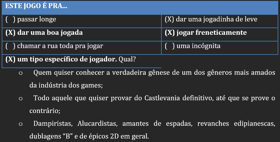 Contra o último chefe, cuja identidade, por ética profissional, prefiro manter em sigilo, o jogo dá só uma palhinha, coisa de 10 segundos, mas tão repleta de informações para os mais atentos… que chega a ser genial! Por exemplo, é dito qual escudo funciona melhor na batalha, e também que o dampiro pode equipar uma certa poção que dará muita resistência contra determinados ataques do “dono do castelo”…