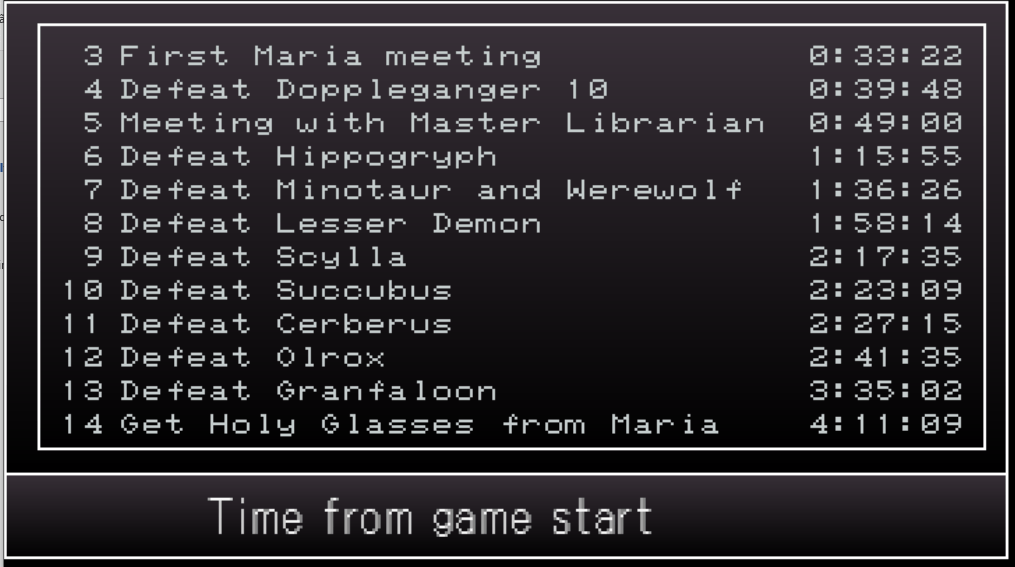 O que não se pode ignorar, a despeito de preferências individuais, é a existência e relevância do fenômeno: muita gente tentando bater recordes de proficiência e rapidez em Symphony of The Night. Fico feliz, não ironicamente, pois o fato atesta o quanto o jogo é universalmente adorado. Sinceramente, não gosto de dar uma de Michael Jackson¹ por aí nem usar exploits da mecânica de jogo para não penar com nada, nem estar onde eu não deveria estar cedo demais no jogo. Do que eu gosto de fato é desafiar a mim mesmo: em quanto tempo posso melhorar meu último desempenho? Posso vencer esse boss sem levar hits? E se eu tentar um novo esquema de equipping da próxima vez? E creio que foi para tipos como eu que a Konami resolveu incluir mais um menu no “new game +” ao depararmo-nos com o bibliotecário multi-uso: o time attack mode, em que você confere quanto tempo demorou para avançar na narrativa (geralmente os marcos são as batalhas com os chefes). Como é um add-on totalmente opcional e inofensivo, é muito bem-vindo.