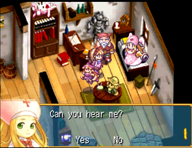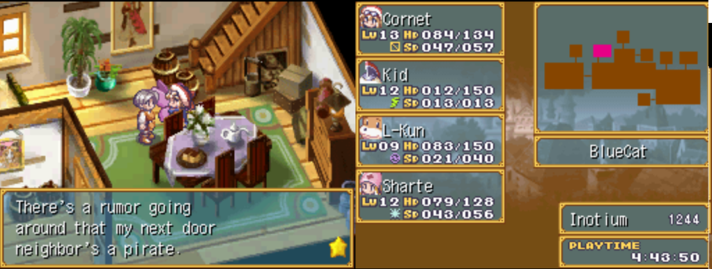 Uma novidade do remake é o minigame existente em cada vilarejo ativado pela leitura de uma placa, em que o usuário sopra o microfone do hardware do DS para gerar “notas musicais de trompete”. Não leva mais do que 5 segundos e rende uns trocados. Considerando que poucos gamers experimentarão no portátil de origem à data, é algo perfunctório e inofensivo, mas curiosidade válida. Parece que não importa que tipo de som você emita, desde que conserve o volume constante para se dar bem. Como eu mesmo experimentei a gameplay por emulador, e até desconheço se é possível configurar um microfone para incluí-lo nos controles, não pude me beneficiar desse implemento. De toda forma, terminei o jogo bastante rico, pois a engine de enriquecimento é assaz generosa (quem diria que além de descolar um príncipe Cornet ainda sairia rica – com muitos Inotiums – de seus apertos…)!