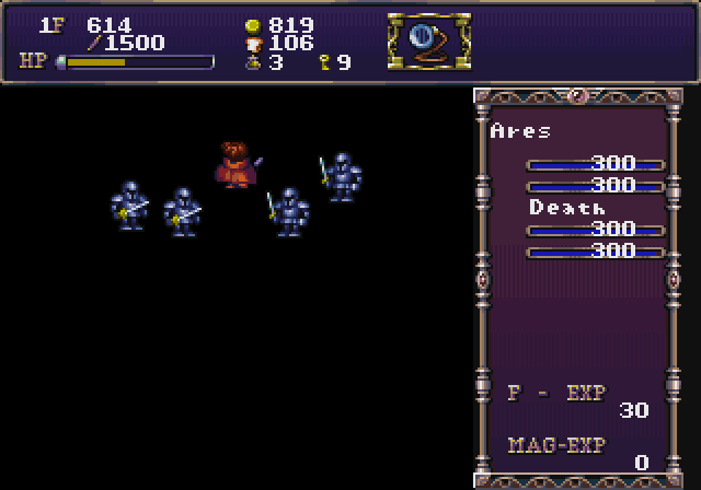 Então você pensa: quando começa a parte de matar dragões? Caminhando até o cemitério mais próximo, marcado por uma lápide também do mesmo tamanho do nosso protagonista, conjuram-se vários inimigos com quem lutamos. Mas nada de dragão, ainda. São 5 ou 6 character designs que se repetirão ad infinitum nesse mundo. Cada batalha é travada como nos jogos desse período da Falcom, sem botão de ataque, mas é um action RPG, as coisas aqui se dão em tempo real com a lei do atrito: basta atingir/colidir com o inimigo em linha reta. Só que aqui o sistema é especialmente chato, não é como em Ys em que há inúmeros fatores a se levar em conta. Basta que se esteja frente a frente e uma guerra de atrito iniciará quando ambos se chocarem. Você levará a melhor no final, após alguns instantes. Nenhuma estratégia, como incidir por trás ou na diagonal. Você só fica parado e “espera acontecer”. O que há de magia em DS é do tipo assistência, jamais ataques diretos: destruir rochedos, teleporte, congelar inimigos.